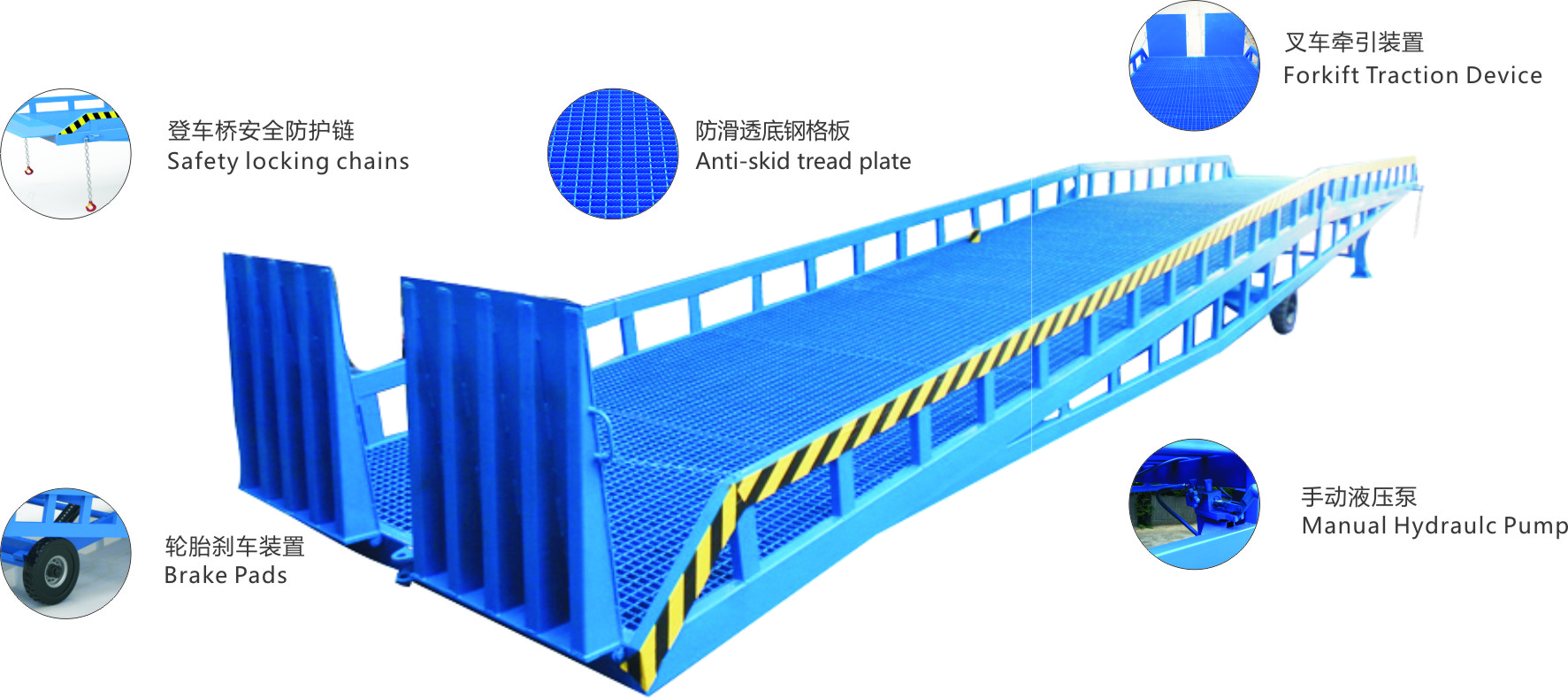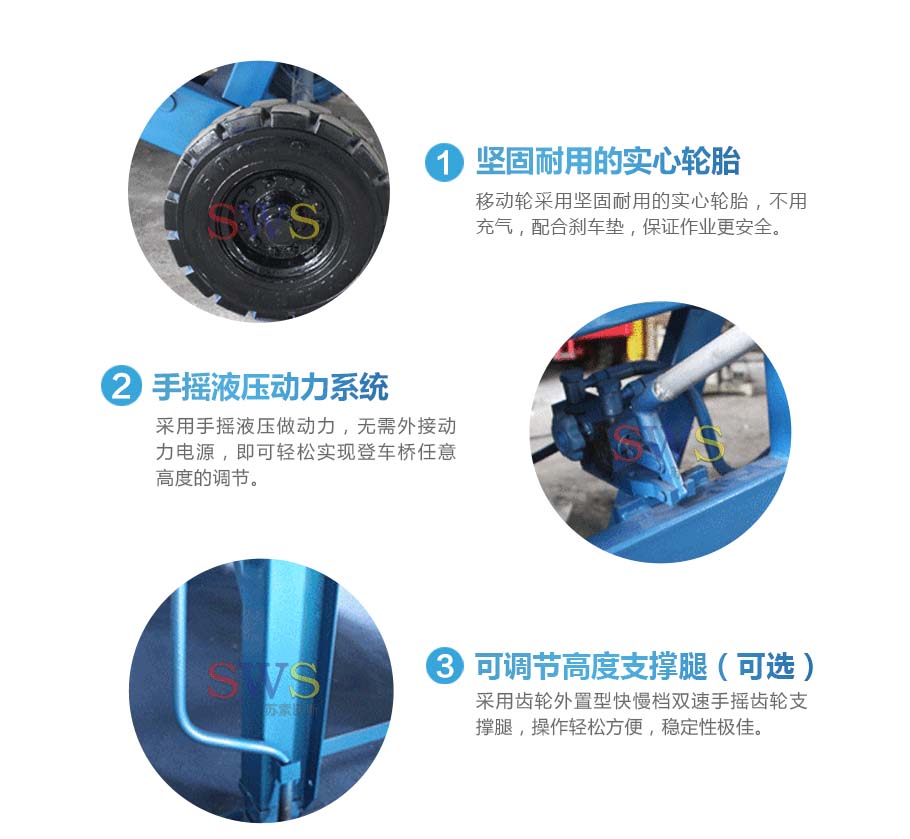 采用人工液壓動力,勿須外接動力電源即可輕松實現(xiàn)登車橋的高度調節(jié)。